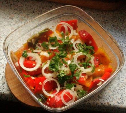 Z takiej papryki robię sałatkę. Kroję ją niezbyt cienko (ale gdy ktoś woli w cienkie paski, niech tak zrobi). Układam, aby kolory się mijały (można po prostu wszystko wymieszać). Przybieram krążkami cebuli i posiekaną zieloną natką pietruszki. Mogą to być świeże zioła. Teraz wystarczy już tylko oliwa. Kto chce – soli, ja daję tylko pieprz. Taka sałatka w zasadzie wystarcza za całe danie. Z bagietką (jest ich teraz rozmaitość: wiejskie, na zakwasie, obok francuskich, paryskich i prowansalskich) lub ciabattą.