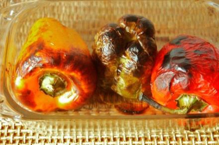 Papryka pieczona. Kilka razy już opisywałam jej wykorzystanie, ale może warto pokazać, jak ją opiec. Umytą w całości układamy na blasze lub w naczyniu żaroodpornym w piekarniku, najlepiej pod górnym, opiekaczem. Skórka na niej ma się mocno zrumienić, nawet zwęglić, nie bójmy się tego. Ale tylko skórka – nie sam miąższ. On ma być miękki i słodki. Strąki trzeba obracać, aby skórka rumieniła się z każdej strony. Warto kontrolować, aby cała papryka się po prostu nie spaliła, będzie nie do użycia.