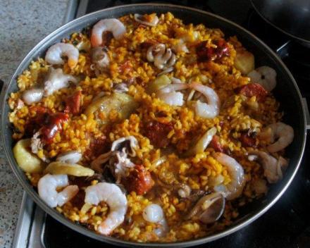 Drugą propozycją jest hiszpańska quasi-paella. Nie musi być ortodoksyjnie ugotowana według konkretnego przepisu. Po przyrządzeniu kilku takich zgodnych z przepisami, dałam radę wymyślić swoje wariacje na temat tego dania. Głównie idzie o to, aby ryż (najlepiej ten okrągły, ale przecież nikt nam w patelnię zaglądać nie będzie, gdy mamy podłużny – weźmy go) podsmażyć z cebulką w oliwie, potem zalać jakimś płynem (wywar z kostki, własny rosół, wino białe lub woda; wtedy pamiętajmy o soleniu). Gdy ryż zacznie wchłaniać płyn, dodajemy treściwszy wkład białkowy. Ja wrzuciłam kilka krewetek i ośmiornic (mrożonych, przelanych wrzątkiem) oraz plastry bakłażana obsmażone na oliwie. Ale można dać jakąś wędlinę (patrz: wyżej), kawałki kurczaka pieczonego lub z rosołu, inny drób, kawałeczki pieczeni itd. I jakieś warzywa: paprykę, pomidory, seler naciowy.