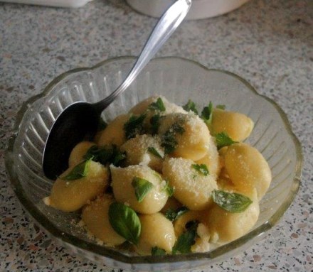 Podobnie ugotowane kluski ja podałam con basilico, czyli z bazylią – bez cynamonu i cukru, tylko z oliwą (zamiast masła) i z tartym serem. Z przepisu podstawowego można zagnieść kluski, ugotować je, wymieszać z masłem lub oliwą i postawić na stole obok sera, młynka z cynamonem i cukierniczki oraz porwanych listków bazylii. Dzieci niech same wybiorą, czym swoje gnocchi doprawią.