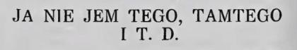 Jeśli takie grymasy stanowią trudność w życiu codziennem, to stokroć gorsze mają w życiu masowem – na przykład w pensjonatach. (…) Sekretem monotonji odżywiania W większości pensjonatów jest właśnie niejedzenie szeregu dań przez gości. Zagranicą z takimi gośćmi nie robi się dużo ceremonji. Jadłospis jest taki, jaki daje się ułożyć stosownie do pory roku i możliwości rynkowych; kto czegoś z tych potraw jeść nie chce – może nie jeść i pozostać głodny, albo też obstalować sobie inne danie po znacznie wyższej cenie.