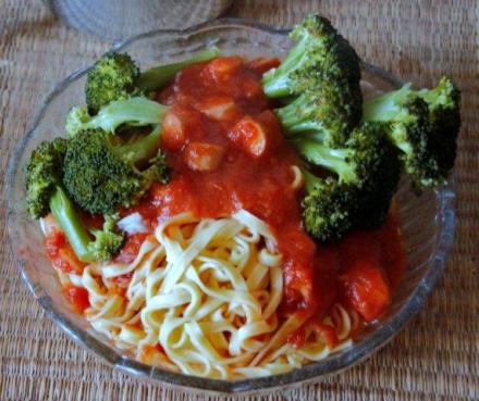 Trzeba było coś przygotować z domowych zapasów. Zawsze mam jakąś passatę z pomidorów. Makaron. I już właściwy kierunek. Włoska pasta. W naszym wypadku – pasta fresca. Ostatnio takie można kupić. Gotują się trzy minuty. Trzeba pilnować, aby nie rozgotować. To potrawa najprostsza jaka być może. Nie ma co robić zbyt długiej przerwy w filmie bądź co bądź bardzo długim, nawet jeżeli oglądamy tylko pierwszą część. Dodałam do niej parówki cielęce. W zamrażalniku mam zapas na czarną godzinę. Nie ma co oszczędzać. Kupujmy najdroższe, a jeżeli są w opakowaniu zawsze sprawdzajmy, co zawierają. Czy w tych cielęcych jest cielęcina, a w drobiowych drób. Z warzyw – wyjęłam z lodówki brokuły. Ale może to być papryka. Podduszona cebula z czosnkiem. Marchewka pokrojona w dość grube talarki i podgotowana lub podduszona.
