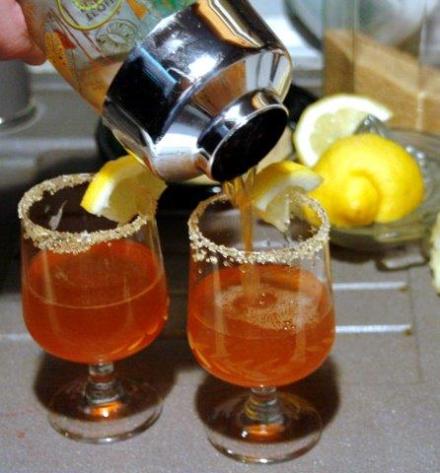 Cukier wzięłam brązowy. Bardzo pasuje do napoju. Bitters stanowiła angostura. Mieliśmy curaçao. Kieliszki udekorowałam częścią plasterka cytryny. Poza tym, jak w przepisie. Pycha! Gdy mnie odwiedzą przyjaciółki, zapoznam je z tym koktajlem. Na pewno wprowadzi nas w beztroski nastrój.