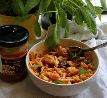 Seler ścieramy na tarce lub w mikserze. Nie za cienko. Mieszamy z sosem z orzeszków ziemnych. Jeżeli jest pikantny, nie dodajemy posiekanej papryczki chili. Jeżeli jest w wersji łagodnej – można dodać. Dodajemy kilka, kilkanaście rodzynek. Posypujemy świeżymi ziołami, ja dałam szałwię.