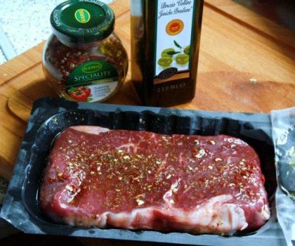 Mięso obmyte obsuszamy. Posypujemy przyprawą – ja wybrałam mieszankę suszonych pomidorów i czosnku – i smarujemy oliwą. Odstawiamy co najmniej na pół godzinny, ale nie w lodówce. Jeżeli mięso przygotujemy wcześniej i zostawimy w lodówce na kilka godzin – wyjmujemy je te pół godziny przed smażeniem. Patelnię grillową lub grill mocno rozgrzewamy. Smażymy stek po 2–3 minuty z każdej strony (nie wysmażajmy go). Potem jeszcze po minucie. Nie dziurawimy go, przekładamy ostrożnie. Odstawiamy na kilka minut, kroimy na pół.