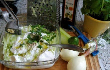 Ogórek i cebulę zetrzeć na tarce z dużymi oczkami. Wrzucić do jogurtu, wymieszać. Dodać sól i pieprz, wyciśnięty czosnek, posiekane szczypior i zioła oraz oliwę. Wymieszać ponownie. Przed podaniem posypać odłożonymi ziołami, szczypiorem, polać łyżką oliwy i posypać świeżo mielonym pieprzem.