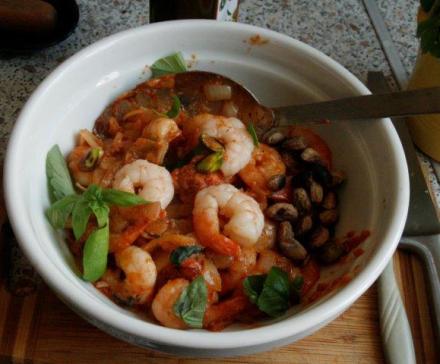 Do tych dań, które się przyrządzi w 10 minut (pod warunkiem, że nie będzie trzeba czyścić krewetek z czarnych żyłek, pancerzyków i ogonków – wrrr, musiałam to robić; ogonki zostawiłam), podajemy bagietkę. U nas była pełnoziarnista. Komu za mało czosnku, może podać pieczywo czosnkowe. Samodzielnie przygotowane lub podgrzane z tego kupionego. No i ulubione białe wino. Schłodzone. Może włoskie lub greckie?