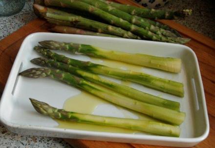 Wczesna wiosna to czas młodych zielonych szparagów, ulubionych przez niektórych. Umyć szybko – nie zostawiać w wodzie – odcinając białe łodyżki. Związywać w wiązki, zanurzyć we wrzącej osolonej wodzie. Gotować 8 minut. Nie mogą być przegotowane; wiele zależy od ich świeżości. Odstawić. Postawić patelnię na wolnym ogniu, włożyć do niej 4 łyżki masła (na 1 funt [450 g] szparagów) Kiedy masło się roztopi, dodać szparagi, wciąż związane. Dołożyć 4 łyżki gęstej śmietany. Nie mieszać, lecz ciągle poruszać patelnią we wszystkich kierunkach, aby szparagi pokryły się masłem i śmietaną. Wtedy zdjąć z ognia. Umieścić szparagi na okrągłym nagrzanym półmisku, główkami na zewnątrz. Nici ostrożnie przeciąć nożyczkami. W środku umieścić pół filiżanki śmietany ubitej z pół łyżeczki soli. Podać, zanim śmietana się zacznie topić. To gastronomiczne święto. I piękno dla oczu.
