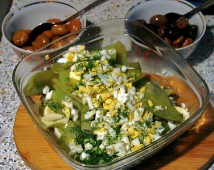 Groszek obrać z włókien, które ma zwykle po obu stronach strąka. Strąki zostawić w całości lub przepołowić. Gotować na parze 10 minut, aby strączki pozostały twardawe, kruche. Doprawić solą i ew. cukrem, gdyby nie dość był naturalne słodki. Odcedzić. Przełożyć do salaterki. Przykryć jajkiem posiekanym razem z koperkiem. Na wierzchu położyć kilka płatków masła.