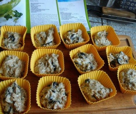 Zmieszać składniki płynne. Oddzielnie – pozostałe. Wymieszać jedne z drugimi. Wyłożyć do foremek silikonowych lub papierowych. Piec 15–20 minut w 180 st. C.