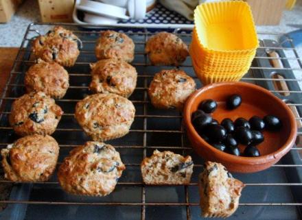 Kończę opis przepisem własnym. Na… muffiny. Są prostą do wykonania odmianą pieczywa śródziemnomorskiego. Przepis zaczerpnęłam z pisma kulinarnego kupionego ostatnio we Francji, ale go zmodyfikowałam w stopniu zasadniczym. Oryginalny proponuje pomidory suszone, u mnie są czarne oliwki. Dałam także mieszaninę mąki pszennej z gryczaną, która temu śródziemnomorskiemu dodatkowi do dań nadaje szlifu polskiego. A co, łączmy tradycje i smaki bez kompleksów! W końcu i tak najważniejsze nie jest to, czy coś jest smaczne, ale czy komukolwiek smakuje!