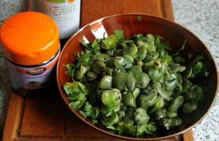 Bób posolić i ugotować na parze. Czas gotowania zależy od jego wieku. Młodszy jest gotowy po dziesięciu minutach. Trzeba sprawdzić, aby był już miękki, ale jędrny i jeszcze się nie rozpadał. Wyłuskać do salaterki. Skropić najlepszą oliwą, posypać czarnym sezamem.