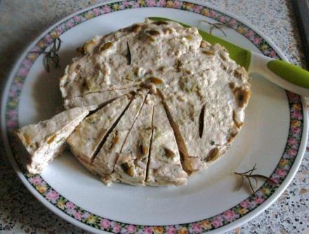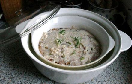Wbrew pozorom są to dania bardzo łatwe do przyrządzenia, o czym sama się przekonałam, gdy wykonałam przepis z przywiezionej z Francji „Kuchni lata”. Jedno wyjaśnienie: mam formę o kształcie typowym dla wykonania teryny, czyli owalną (choć nie kamionkową, tylko ze szkła żaroodpornego), lecz z różnych powodów nie chciałam jej wykorzystywać. Użyłam więc foremki okrągłej. Włożyłam ją w drugą formę, większą, a między nie nalałam wody i dopiero tę dużą formę przykryłam. Chodziło mi o to, aby mięso kurczaka nie wyschło. Cel osiągnęłam. A moja teryna miała kształt okrągłego tortu.