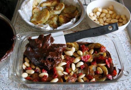 Do foremki wlać nieco kremu czekoladowego; będzie stanowił kolejne warstwy. Na nich układać plastry bakłażana, przekładać także bakaliami, aż do zużycia wszystkich plastrów bakłażana. Na wierzchu ma być krem czekoladowy. Zapiekać 15 minut w 100 st. C.