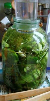 Wodę zagotowujemy i studzimy, a potem solimy (odnajdźmy proporcje w Sieci, ja mam swoją miarę: na pięciolitrowy garnek biorę dwie czubate łyżki soli kamiennej). Kto chce mieć ogórki szybciej, niech je zaleje wodą ciepłą. Fermentacja ruszy błyskiem. Przyśpieszy ją też solidne posolenie. I już. Obciążmy czymś ogórki, aby były całkiem zanurzone; klasyczny jest kamień, ja robię to szklanką z wodą. To wszystko.
