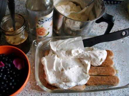 Biszkopty nasączyć wywarem z kawy, ewentualnie wzmocnionym likierem. W foremce układać warstwy kremu z mascarpone i biszkoptów. Można przekładać owocami i listkami mięty lub ułożyć je na wierzchu deseru razem z pozostawionymi płatkami róży.