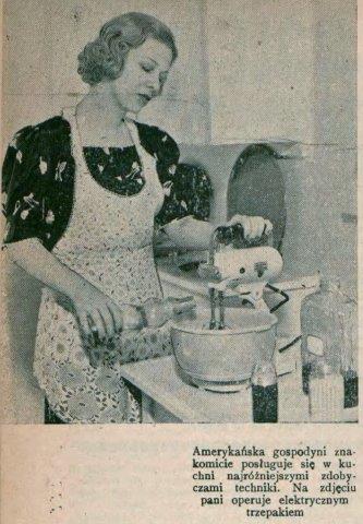 Nikt nam nie zabroni do tego deseru retro dodać utartej róży i listków mięty. Kaszka zyska na oryginalności. Wnosząc ją powiedzmy: tak gotowano przed wojną. Przepis pochodzi z roku 1934. Zdjęcie ukazujące nowoczesność w kuchni – z roku 1939.