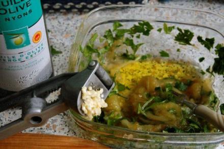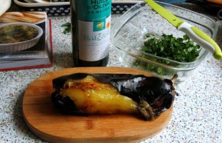 Następnie wyjmujemy je z piecyka oczyszczamy ze skórki. Miąższ trzeba posiekać tasakiem na desce, popieprzyć, posolić i wymięszać z drobniutko posiekaną cebulką, której się bierze w ilości jednej czwartej tego, ile mamy bakłażanów. Niech tak postoi w chłodnem miejscu około