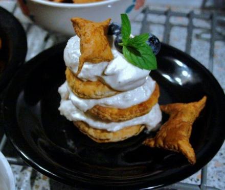 Po daniu głównym możemy podać bardzo prosty deser także z tysiąca listków. Łączy ciasto upieczone z gotowego ciasta francuskiego z bitą śmietaną i owocami.