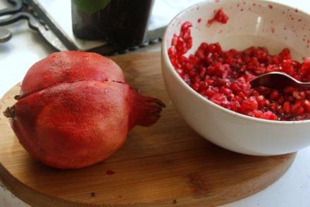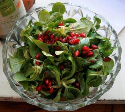 Do pieczeni proponuję podać sałatę. Bardzo lubię roszponkę. Jest łagodna i aksamitna. Może ją nieco uegzotycznić? Kupmy owoc granatu. Po przecięciu na pół, wyjmijmy z niego pestki. Jest z tym nieco pracy. Trzeba to robić nad talerzem, aby nie uronić pysznego soku. Granaty są bardzo smaczne i dekoracyjne. Tylko te pestki… Trzeba je mozolnie oczyścić z błonek, a wtedy rozwiną cały urok. No i owoce muszą być dojrzałe.