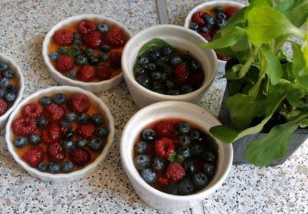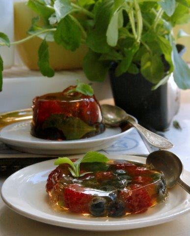 Galaretkę przyrządzić zgodnie z poradą na opakowaniu. Nieco przestudzoną, ale jeszcze ciepłą zalać umyte i obsuszone owoce. Między nie wsunąć kawałeczki listków stewii. Zastudzić w lodówce. Podawać samą, z dodatkowymi owocami i listkiem stewii, lub z bitą śmietaną albo kulką lodów.