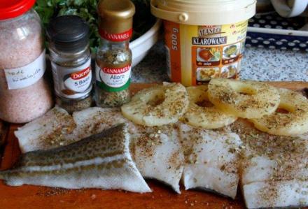 Uruchomiłam fantazję. Ale najpierw dorsza kupiłam. Szkoda, że nie należy już do ryb najtańszych. Chociaż można wypatrzyć jakieś promocje. Wypatrzyłam taką tanią rybę (24 zł za kilo) o zwartym jasnym mięsie. To wskazuje na jej świeżość. Ryba o mięsie rozpadającym się, jakby postrzępionym, nie jest świeża. Gdy mamy wątpliwości, nie obawiajmy się ryby powąchać. Zapach także wskaże, czy jest świeża. W domu rybę obmyłam i starannie osuszyłam. Spojrzałam na półeczkę z przyprawami. Oto, co wymyśliłam.