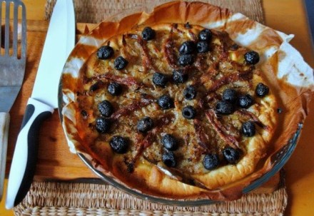 W dodatku przyrządziłam kolejną z dość szybkich potraw, rodzaj placka. Kuchnia francuska – bo do jej doświadczeń sięgam – zna takich różnych placków dużo. Są wśród nich tarty, quiche z Lotaryngii, jest fougasse, który już opisywałam. Dzisiaj kolejny wypiek. To pissaladière. Placek z Prowansji. Nazywany bywa prowansalską pizzą. I wszystko jasne. Przyrządza się szybko, pod warunkiem, że przedtem zaopatrzyliśmy się w potrzebne składniki: czarne oliwki, filety anchois, pastę z oliwek tapenade oraz gotowe kruche ciasto. Ambitni wyrabiają ciasto sami; co zresztą idzie piorunem. Dłużej dusi się cebulę z czosnkiem, ale to możemy zrobić wcześniej.