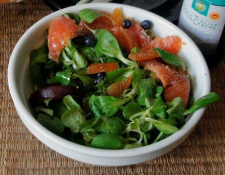 Obiad: kawałek łososia z rusztu, 1/2 sałaty zielonej, kilka albertów, 1/2 grapefruita, herbata.