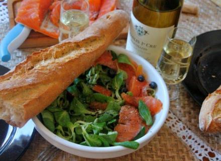 Sałatkę jemy na obiad. Z grzanką lub kromką chrupkiego chleba. Oczywiście, polecam taki obiad i tym, którzy nie muszą lub nie chcą się odchudzać. Oni mogą sięgnąć po chrupiącą bagietkę i kieliszek białego wina (u nas było wspaniałe Chablis 1-er cru Montmains 2010). Przy dietach każdy alkohol odstawiamy, tak jak i bagietki. No i nie ma mowy o deserze.