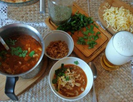Można dodać: no i zimne piwo. Bardzo pasuje do gorących flaków. Serem powinien być pikantny parmezan. Ku swojemu zdziwieniu też go nie znalazłam w lodówce. Wzięłam więc ser szwajcarski z charakteru i też się nadał. Gdy daje się bulion z kostki – nie używa się soli. Zamiast papryki mnożna wziąć pieprz. Z zasmażki można zrezygnować, ale chciałam, aby potrawa nie była wodnista, oprócz tego smak świeżego masła wzbogacił jej smak. Cebula smażona to gotowy wyrób, sprzedawany w sklepach z żywnością orientalną. Świeże zioła postawione już na stole to: majeranek, natka pietruszki, koperek, kolendra. Można je wymieszać lub każde podać oddzielnie. Sos pomidorowy dałam w miejsce zwykle używanych warzyw i cebuli, której, jak się okazało, także nie miałam (gdybym miała, to bym ją spożytkowała w zasmażce). A miseczka sosu stała w lodówce.