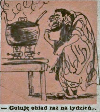 Potem wyjaśnił: – Idę, widzi pan, na targ, kupuję włoszczyznę, makaron, kaszę, trochę wieprzowiny i cielęcinę, jakaś rybę. Wszystko to potem zalewam wodą i gotuję. Trochę soli i pieprzu. Wygoda! – Mam na przykład dziś apetyt na rybę, poszperam w garnku i mam rybę. Chcę trochę makaronu – mam makaron. Chcę zupę – mam zupę.