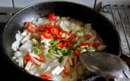 W patelni o grubym dnie rozgrzać oliwę lub olej, dodać mąkę, zrobić ciemną zasmażkę. Dodać pokrojone warzywa: cebulę, paprykę, gałązki selera. Zasmażyć.