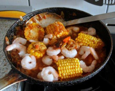 Wrzucić pomidory z kartonika, szklankę bulionu, poddusić. Po kwadransie dołożyć pokrojone kolby kukurydzy.
