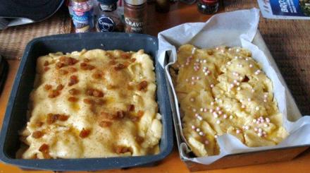Jabłka w tym półkruchym cieście smakują nie tylko z cynamonem (uwaga, nie wszyscy go lubią!), ale i ze szczyptą goździków. A może podkręcimy smak tego wybitnie jesiennego ciasta imbirem lub kardamonem? Tym razem z podanych proporcji upiekłam, jak widać, dwa ciasta. Jedno posypałam rodzynkami, drugie – cukrowymi kuleczkami do wypieków. Gdy się zdecydujemy na dwa ciasta, możemy je odmiennie przyprawić lub do jednego z nich dodać kilka śliwek, a do drugiego – plasterki gruszki. Wtedy jedno możemy nazwać szarlotką z Ursynowa, a drugie jabłecznikiem z sąsiadujących z nim Kabatów. Ciasto z jabłkami, mocna herbata, książka lub film – na dobre zakończenie pracowitego tygodnia. Polecam jako wypróbowany sposób na listopad.