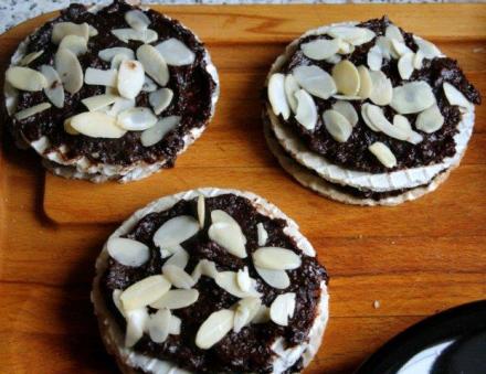 Gdyby masa zastygła, można ją podgrzać w mikrofalówce lub, mieszając, na najmniejszym ogniu. Wafle smarować jeszcze ciepłą masą, składać pod dwa lub trzy. Wierzch posmarować czekoladą, posypać migdałami lekko je wciskając.