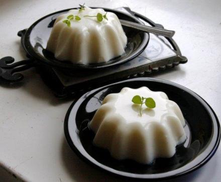 Deser można wlać do naczynek przeznaczonych na poszczególne porcje lub do jednej większej salaterki. Galaretkę można podać z owocami świeżymi, sokiem, konfiturami, plasterkami cytrusów przesmażonymi w syropie. W sezonie można ozdobić którymś z jadalnych kwiatów. Ja podałam tylko z gałązką mięty (może być melisa). Galaretka z kwaśnego mleka należy do tych deserów z dzieciństwa, które mogą wywołać nostalgię tak pasującą do klimatu filmu Alfreda Hitchcocka.