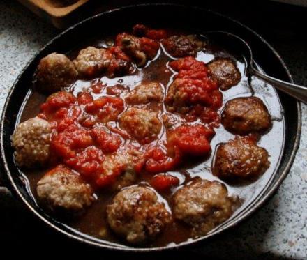 Gdy wszystkie gotowe, każdą obtaczać w mące. Kolejno, pod kilka, podsmażać je w rozgrzanej oliwie, odkładać. Patelnię zalać bulionem lub/i winem. Zdeglasować, czyli w gotującym się płynie rozmieszać przysmażone resztki ze smażenia. Do tak utworzonego sosu włożyć wszystkie pulpety. Dusić przez 20–30 min. Włożyć pomidory, doprawić do smaku, pogotować z 10–15 minut.