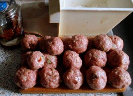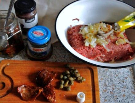 Mięso mielone wyrobić z przestudzoną cebulą i pastą sardelową oraz z namoczonym pieczywem. Dodać kapary i pomidory suszone, przyprawić pieprzem i solą, jeżeli potrzeba (pasta sardelowa jest słona). Rękami opłukanymi zimną wodą formować okrągłe kule wielkości małych mandarynek.