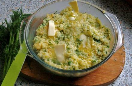 Kaszę opłukać na sicie. Dwa razy więcej wody niż kaszy osolić, zagotować. Dołożyć kaszę, gotować 10 minut, odcedzić. Wymieszać z masłem i posiekanym koperkiem (część zostawić do posypania po wypieczeniu). Wyłożyć do żaroodpornego naczynia wysmarowanego masłem. Zapiekać 20–30 minut.
