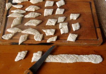 Utrzeć funt świeżego suchego twarogu, dodać 1/4 funta mąki, 5 żółtek, łyżkę masła i trochę soli, wszystko dobrze wymieszać, wyłożyć na stolnicę mąką posypaną, potaczać okrągłe wałki, każdy z nich płaszczyć nożem karbowanym, pokrajać ukośnie małe pierożki i wrzucać do gotującej się wody; gdy wypłyną na wierzch wybrać je łyżką durszlakową na gorący półmisek i polać masłem zrumienionem z bułeczką. Oddzielnie można podać bitą śmietanę i cukier z cynamonem.