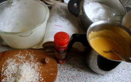 Z mąki i masła zrobić zasmażkę. Po 2 lub 3 minutach ciągłego mieszania dodać mleko. Ubić wszystko trzepaczką, aż uzyska się bardzo gęsty beszamel. Cały czas mieszając, doprowadzić do wrzenia, po czym zdjąć z ognia. Dodać cały żółty ser oraz 1 łyżeczkę parmezanu. Mieszać tak długo, aż ser się roztopi. Sos odstawić na kilka minut, by nieco ostygł. Po minucie lub dwóch dodać po jednym żółtku, za każdym razem starannie mieszając. Upewnić się, czy nie trzeba dodać soli, choć zarówno maggi, jak i sam ser powinny być wystarczająco słone.