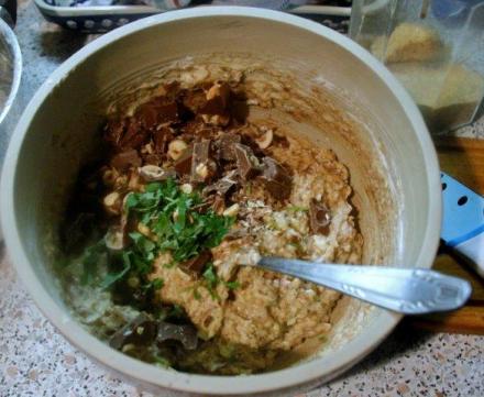 Suche składniki, czyli mąkę, kakao, mielone przyprawy korzenne, cukier, sól i proszek do pieczenia, zmieszać. Mleko połączyć z roztopionym masłem i roztrzepanymi jajkami. Płynne składniki wlać do suchych, szybko i starannie wymieszać, choć masa nie musi być idealnie gładka. Wsypać do niej posiekaną czekoladę z orzechami i porwane lub przesiekane liście melisy oraz skórkę startą z cytryny.
