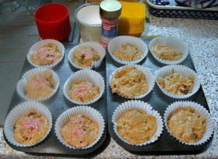 Muffiny przełożyć do foremek (można już kupić papierowe; bardzo wygodne dla dzieci) i udekorować cukrem. Piec w piekarniku nagrzanym do 200 st. przez 25–30 minut. Dodatkowo posypać cukrem.