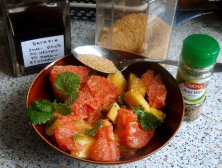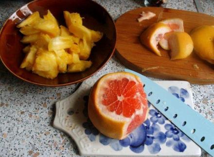 Ananasa pokroić w drobne kawałki. Z owoców grejpfruta skroić skórę, ostrym nożem spomiędzy twardych błonek wyciąć fileciki. Najlepiej robić to nad miseczką, aby zbierać ściekający sok.