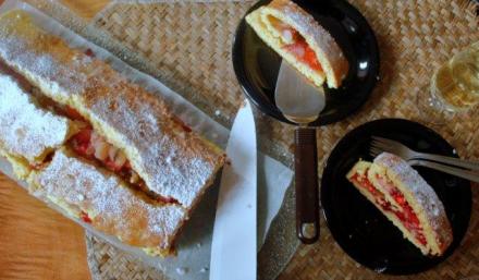 Zabrałam się za ten z programu 72. To Francuska rolada z galaretką, czyli Ciasto pomarańczowo-migdałowe, wypełnienie truskawkowe. Składa się z dwóch przepisów: na Biscuit roulé à l’orange et aux amandes, co przetłumaczono jako Cienki biszkopt pomarańczowo-migdałowy, oraz na Farce aux fraises cio-cio-san, czyli Wypełnienie ze świeżych truskawek z migdałami i kumkwatami. Ale pięknie brzmi; prawda? Przyznam, że ta nazwa przyciągnęła moją uwagę. A że miałam wszystkie składniki…