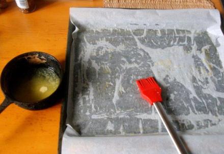 Stopić w rondelku 1 1/2 łyżki masła. Blachę wysmarować masłem, wyłożyć papierem do pieczenia i także jego wysmarować. Resztę masła zostawić. Piekarnik nastawić na 190 st. C. Przygotować biszkopt.