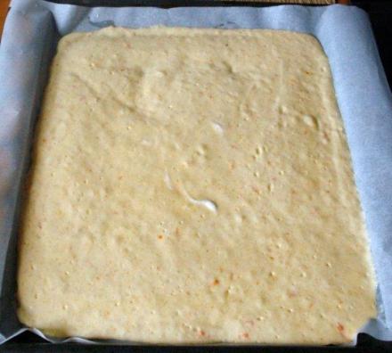 Pianę nałożyć na żółtka z dodatkami. Szybko, a zarazem delikatnie wymieszać silikonową łopatką. Pod koniec dodać stopniowo masło, po 1/2 łyżeczki. Masę od razu wyłożyć na przygotowaną blachę. Uderzyć formą o stół, aby się rozprowadziło równomiernie.