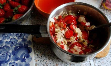 migdałami i kumkwatami. [Tu zmieniłam przepis: w syropie z cukru i wody krótko obgotowałam owoce kiwi pokrojone w półplasterki. Do płynu dodałam pozostawione truskawki oraz odcedzone kiwi]. Wszystko odstawić do wystygnięcia, a potem wstawić do lodówki, aby się ścięło.