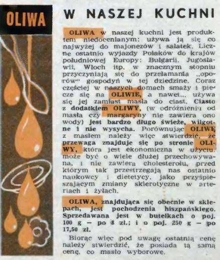 Oliwy w tej potrawie nie żałujemy. Podkreśla warzywny smak, no i jest zdrowym tłuszczem. O czym wiedziano także w latach 60. ub. wieku, w czasach uspołecznionego handlu pod skrzydłami PRL-u. Pamiętam z mojego domu smukłą buteleczkę oliwy nicejskiej (taka nazwa była na etykiecie). Nie była tania, używano ją z szacunkiem, rozważnie, niekiedy kręcąc z niej majonez. Ale jak widać, na rynek rzucano także oliwę hiszpańską. Z notki w „Stolicy” dowiemy się, ile kosztowała. Zwróćmy uwagę na błąd językowy w ostatnim zdaniu.