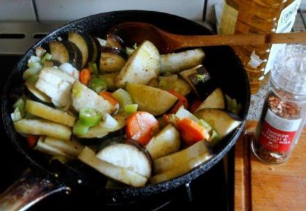 Bakłażany i cukinie umyć, wytrzeć, pokroić w cząstki mniej więcej jednakowe. Marchewkę oczyścić, pokroić w plasterki. Dolać do patelni nieco oliwy, dołożyć przygotowane warzywa. Dusić od czasu do czasu mieszając (można pod przykryciem, wtedy skróci się czas duszenia, ale warzywa mogą rozmięknąć, czego lepiej uniknąć). Pod koniec doprawić pomidorami z kartonika.